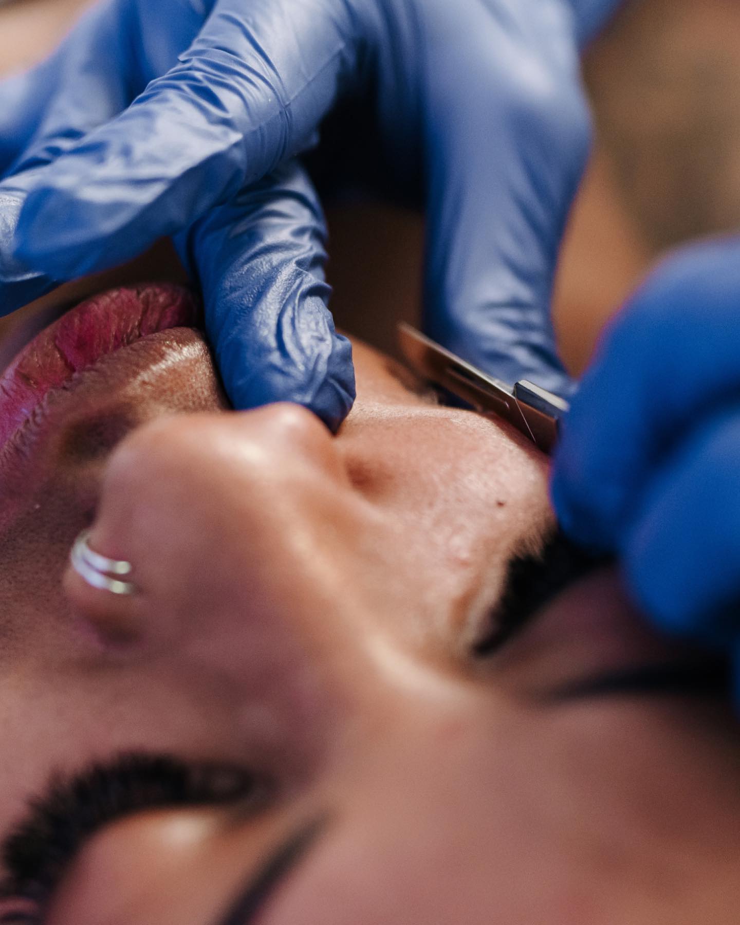 Een ontspannende behandeling waar donshaartjes, vuil, dode huidcellen, make-up resten van het gelaat worden verwijderd met een speciaal ontworpen steriel mesje.
